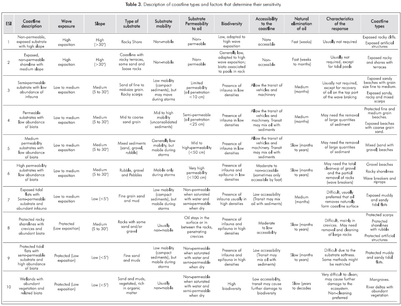One component of the ESI is the scoring of the sensitivity of the different types of coastal ecosystems to oil exposure. This scoring depends on the persistence of oil in the coastal line due to its penetration in the substratum, easy of removal by cleaning crews without causing any additional damage to the ecosystems, and the possible harm to sensitive biological communities or their productivity. Scores are determined by a series of geomorphological elements of the coastline such as the exposure to waves and tidal energy, type of substrate, slope of the coastline, among others (Gundlach & Hayes, 1978; Petersen et al., 2002; SQA/MMA, 2004).