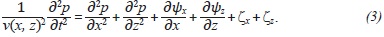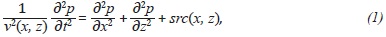 where v (x, z) is the acoustic velocity of the medium as a function of the spatial variables x and z, p denotes the scalar pressure field, and t is the time variable. A discretized version of Equation 1 corresponding to a second-order finite-difference approximation in space and time (Alford, Kelly & Boore, 1974) is given by