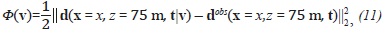 Let v ∈ RgNx·Nz be the vector containing the velocities of the model, for all x and z. The cost function Φ(v) is a scalar that measures the error between the observed and the modeled data. In this work, we use the