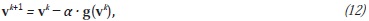 where g(vk) is the gradient of the cost function, obtained with the adjoint state method (Plessix, 2006). In order to find an adequate parameter α, we ran a set of experiments for different step size values and we select the one that retrieves the minimum error norm after a certain number of iterations. This search over different values of α is computationally expensive, and instead this parameter can be estimated using a line-search method, as proposed by Tarantola (1987). The gradient is given by