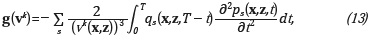 where the wave field qs is obtained with Equation 4 having as source the error between the modeled and observed data, in reverse time. For this reason, qs is called the back-propagated field of the residual.