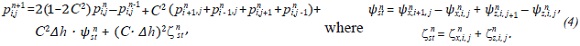 , i and j denote the discrete spatial variables, Δh is the spatial step, Δt is the time step, and n denotes the discrete time variable.