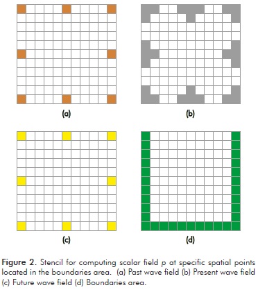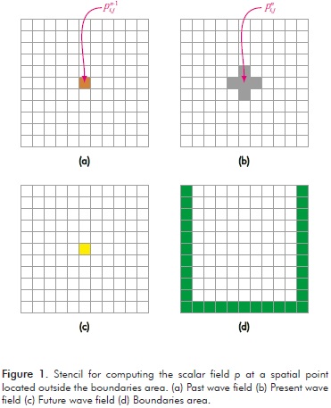 We assign Equation 4 to each thread to calculate every future point of the wavefield in parallel (see yellow points in Figures 1, 2 and 3). The total number of future points that can be computed in parallel in the NVIDIA GeForce GTX 860M are 10240. This occurs since the GPU has 1024 threads per block, two blocks per SMs and five SMs (1024 × 2 × 5, see Table 2). A pseudocode of the implementation is presented in Algorithm 1.