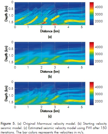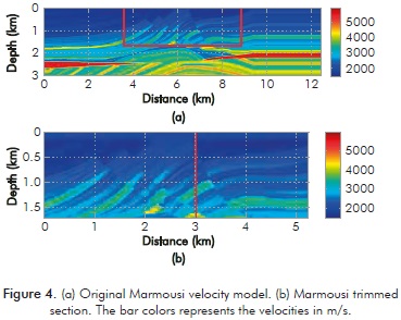 represents the operator that takes the nearest integer. The receivers were placed in line on the surface every 25 m, from the position 525 m to the position 4750 m totaling 170. Each receiver recorded 3.5 s at a time step of 4 ms and each source is a Ricker wavelet with a central frequency of 3 Hz. Equation 4 and the Marmousi model (Figure 5a) were used to obtain the observed data. Figure 5b depicts the initial velocity model, v0, which was generated by applying a horizontal recursive smoothing filter to the original model. The filter was recursively applied twenty times using Equation 15, where vni,j represents a specific pixel in the velocity model.