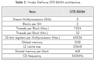 For example, Weiss and Shragge (2013) proposed a parallel implementation for solving the 2D and 3D elastic wave equation on GPU devices, achieving speedups of 10 and 28 times, respectively. The main differences between Weiss’s work and our work are: 1) Weiss’s work only evaluates the Finite Difference in Time Domain (FDTD) implementation inside the GPU whereas our work not only computes the FDTD but also the gradient, and the update of the velocity model inside the GPU. 2) In Weiss’s work, the elastic FDTD is evaluated, whereas in our work we solve the acoustic wave equation. 3) Also, the order of the space discretization in the FDTD is different (Weiss used 8th order in space, we used 2nd order). 4) Finally, the GPU used in their work is the NVIDIA GTX 480x, whereas we used the NVIDIA GeForce GTX 860M.
