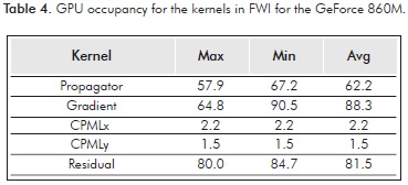 The GPU occupancy metric is defined as the number of threads that are active in the GPU divided by the maximum number of threads. This value ranges from 0 to 100% and measures the efficiency of the proposed implementation. A high occupancy level means an efficient use of the available resources on the GPU. In Table 4, we show the performance of the proposed implementation on a GeForce 860M GPU, in terms of its GPU occupancy. In particular, the kernels ”Propagator”, ”Residual” and ”Gradient” have the higher use of threads in our FWI implementation. Those kernels have a 62.2, 81.5 and 88.3% of occupancy, respectively.