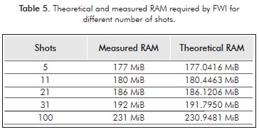 Every term inside the parenthesis of the right side of Equation 16 represents the memory space to store the inputs or outputs of the FWI implementation. Specifically, the first term represents the observed data; the second term the wavelet used in the source; the third term represents the stencil and auxiliary variables required to solve Equation 4, the velocity model and the gradient; the fourth term represents the modeled data; the fifth term the volumes of the propagation and back-propagation processes; the sixth term the CPML vector for the x axis attenuation; the seventh term the CPML vector for the z axis attenuation; and finally, the eighth term represents the residuals used in the back-propagation process. For the geophysical experiment studied in this work, the numerical values of the parameters are Ns = 100, Nt = 875, Ntrace = 170, Nx = 210, Nz = 68, and β = 32. The theoretical amount of RAM required is 230.9481 MiB. We ran various tests to validate Equation 16. In particular we keep the same model size and we change the number of shots used in FWI. The RAM used at each experiment and the theoretical RAM are shown in Table 5.