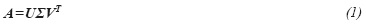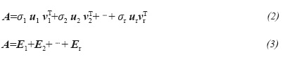 where E1+E2+...+Er are the eigen-images of the r rank matrix A; u1u2,..., ur.... um integrate the orthonormal basis for the rows space of A; an orthonormal basis v1v2,... ,vr ...vn for the columns space of A, and a set of singular values σ1,σ2,...,σr associated with the aforementioned bases (Strang, 1980).