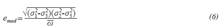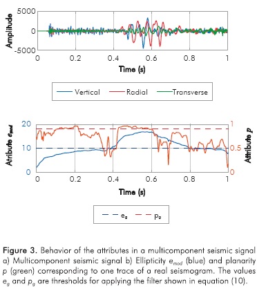 The attribute "e" expresses the largest section area of the polarization ellipsoid adjusted by the semi axis o3. The most appealing feature about this attribute is that it measures the ellipticity of a multicomponent signal without dividing the data by the axis magnitude. Thereby avoiding the lost of the signal amplitude information. Therefore, it is necessary to multiply the magnitudes of the main axes and take into account the high amplitudes present in ground roll noise. Tiapkina et al (2012) introduce the attribute emod, an improvement of the attribute e. This new attribute is less sensitive to ambient noise but is more sensitive to the low frequencies of the signal.