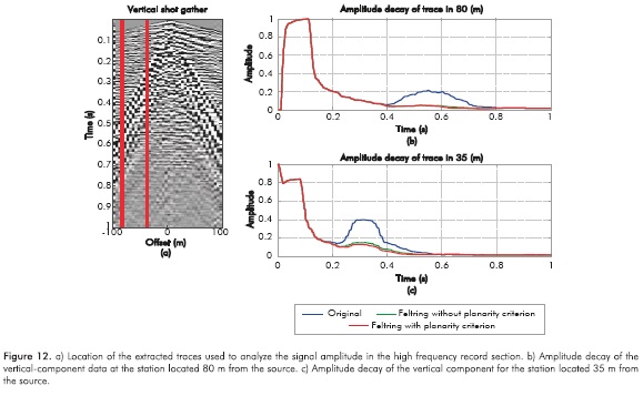 An analysis of decay amplitudes for the first high-frequency dataset is shown in Figure 12. Figures 12b and 12c show that at the stations located 80 and 35 meters from the source, the multicomponent signal amplitude (vector magnitude of the three components) is higher in areas where the ground roll is present. Assuming a slow varying velocity medium, it is possible to approximate the amplitude decay proportional to the propagation time for internal waves and to the square root of the propagation time for surface wave amplitudes. Therefore, the amplitude of the filtered signals shown in Figures 12b and 12c behave similarly to a function decaying in proportion to the square root of time, indicating the presence of surface waves. These amplitude-versus-time figures show that filtered amplitude is reduced in areas where ground roll is present, proving that the filter with the planarity criterion is more effective that the filter that works on a preferential plane. It can also be seen that in those areas where ground roll is not present, there is no difference in amplitude between the original and the filtered signals, showing that the detection attribute has been successful.