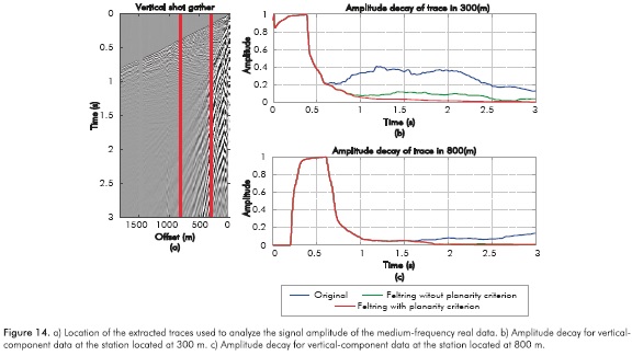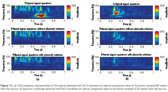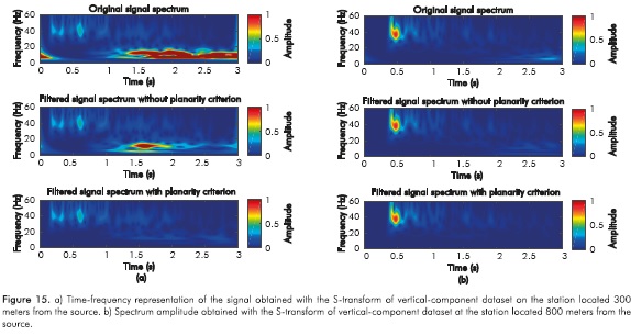 The analysis of the spectra obtained with the S-transform shows the differences between the original and the filtered signals for the station located 300 meters from the source. Figure 15a shows that between 1 to 2 seconds, the filter that does not use the planarity criteria tries unsuccessfully to reduce the ground roll. In contrast, the filter using the planarity criterion attenuates this energy better. Figure 15b shows the spectra of the original and filtered signals for the station located 800 meters from the source, in this case minor differences between both spectra can be observed because the ground roll in this area tends to be planar.