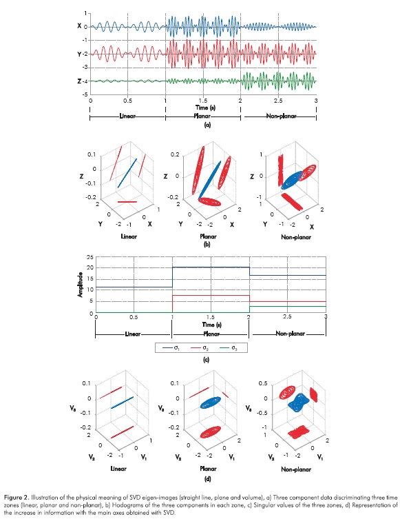 The singular value decomposition allows for a better representation of information. In the specific case of seismic data, it allows an investigator to distinguish between seismic events with different types of polarization. For a better illustration of the physical meaning of SVD analysis, a three-component "conceptual" synthetic signal was produced in which three regions are identified: linear, planar, and non-planar (Figure 2). Figure 2b shows the hodogram for each component and the three regions of different polarization are clearly observed. It is possible to determine the directions of the main axes and its corresponding energy by performing a SVD. These main axes are the directions where greater information content is concentrated, and are represented as the vectors given by the rows of matrix V in equation (1). The energy associated with each main axis is obtained as the square of its corresponding singular value, which is represented by ai in equation (2). Figure 2c shows the amplitude of the singular values corresponding to each zone. In the case of the linear region, only one non-zero singular value is obtained (σ20, σ2=σ3=0). In the planar area, two non-zero singular values are obtained (σ1 > σ2 >0, σ3=0), and in the non-planar zone all of the values are non-zero (σ1> σ2> σ3 > 0).