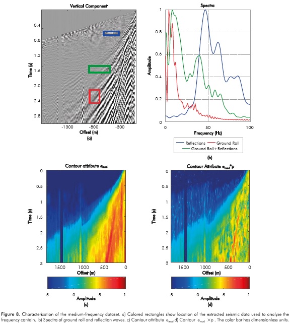 A characterization of the first set of real data was carried out by analyzing the frequency content of the signals interpreted as reflection waves and ground roll, and the behavior of the emod and p attributes in each area of the record section (shot gather). To evaluate the performance of the attributes, we have used color coding to show the values of each attribute. The values of the attributes are shown in a logarithmic scale for a better visualization.