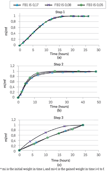 Consolidated samples: Figure 10 presents the saturation curves for the different samples. In a period of 25 hours, the porous media gain weight in the same proportion, suggesting that for all the ionic strength tested, the saturation process has the same behavior (Figure 10a). Subsequently, the rocks get in contact with crude oil, and as the curves have normalized values, it is possible to compare the behavior as a function of time (Figure 10b). The rock that gains more weight in this stage is for the FB3 brine (IS 0.05), which suggests that when the initial system has lower IS, it is more oil-wet.