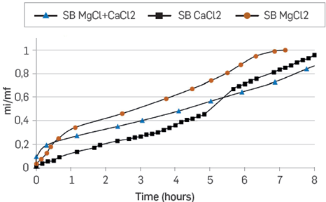 Figure 11 Spontaneous imbibition curves in unconsolidated porous media. Mg2+, Ca2+ and Ca2+ + Mg2+ synthetic brines at IS of 0.08.