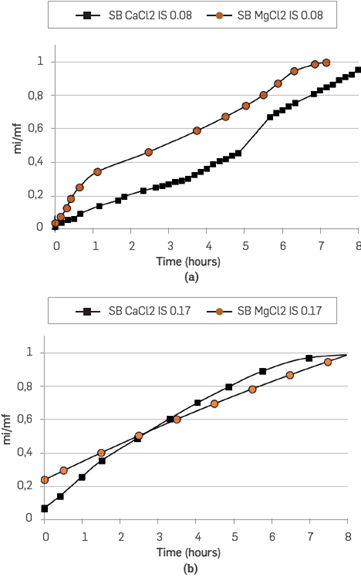 Figure 12 Parallel spontaneous imbibition curves in unconsolidated porous media. Synthetic Mg2+ and Ca2+ brine at an IS of 0.17 and 0.08.