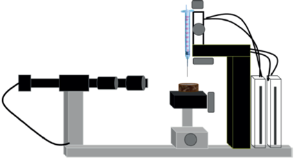 Contact angle. Contact angles are a quantitative measurement of wettability on the surface at a specific point. The results are obtained suspending a drop of the studied fluid at a representative point of the rock surface, and it is executed at the end of every spontaneous imbibition stage. The equipment used for this test is an optical tensiometer OCA 25 (OCA 25 PMC 750). In every angle measurement, two values are considered, right angle and left angle of the drop on the surface. The drop volume in this study is 15μ L. Once the drop is on the surface, a lens captures the image, which is processed in the equipment software. The forms obtained are analyzed considering the pendant drop and the sessile drop method. Figure 3 is the schematic of the compactor equipment used to build the crude oil supported sand samples. Figure 4 shows the representation of the optical tensiometer for contact angle measurements used in this study.