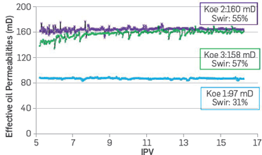 For assessing the displacement efficiency as a secondary recovery process with FB2 and FB3 brines, the sample is saturated with crude oil before each water injection, obtaining, for example, the effective oil permeabilities (Koe1, Koe2, and Koe3) for each of the waterfloods (Figure 7) The Koe values obtained indicate an increase in the flow capacity when a reduction in ionic strength occurs. The high residual water saturation values are attributed to changes in salinity (IS) considered in the experimental protocol. These results are also consistent with the spontaneous emulsification observed with the crude oil used in this study [14], as it will be briefly discussed later in this section.
