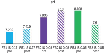 The effluents at the end of every secondary recovery stage were collected and maintained in a temperature control environment to measure pH (@25°C), as shown in Figure 9. In general, the changes in pH recorded during the three corefloods were relatively small (<0.6) and varied depending on the IS strategy. The most considerable pH change was obtained after flowing FB3, which is the experiment with the higher displacement efficiency observed at Swi (Figure 8). These results indicate that there is variation of pH with the different displacement efficiency stages. These results are consistent with different studies that show the relation between pH and low salinity effects [15]. However, the effect of changes in pH still requires further research.