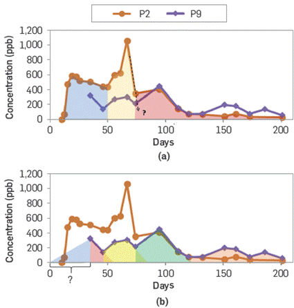 Figure 10 shows the tracer elution curves of the producers (P2 and P9). These curves will be briefly interpreted individually based on the main characteristics observed in each producer. It is worth to mention that producers P2 and P9 are a first and second row offset wells of the injector (II) respectively. From Figure 10, it is clear that the tracer analysis frequency was higher for the closest producer (P2) compared to well P9. This is a common observation in tracer programs were frequently assumes that producer located far from the injector should expect longer tracer breakthrough. Although this is a valid approximation, it is critical to consider a high sampling frequency in all wells in case additional tracer analyses are required.