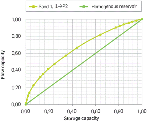 With the method of moments, it was possible to estimate that the oore volume (PV) contacted by the tracer between the injector llanc the P2 producer is 7,300 barrels (Equation 4), finding an accumulatec tracer recovery of 27% (Equation 5). Communication between these two wells is significant in terms of PV and conductive capacity, where 50% of the flow circulating in this sand is conducted in only 27% of its oore volume, as shown in Figure 11. The estimated Dykstra-Parsor coefficient is 0.43, and the Lorentz coefficient is 0.33, endorsing the heterogeneity observed in the flow capacity versus the storage capacity curve of flow unit (Sand 1) (Figure 11). The pore volume contacted by the tracer between the injector Hand the P9 producer s 2,100 barrels, finding an accumulated tracer recovery of 5,7%,