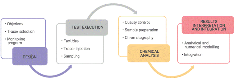 Test execution: This is the operational stage, between design and evaluation. It embraces all the field requirements, including transporting the tracer to the location, organizing injection facilities, executing injection protocols and disposal of materials, and executing the monitoring schedule.