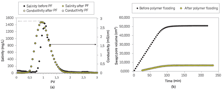 Figure 8 Tracer production curve (a) and swept pore volume by KCl (b) before and after the polymer flooding (PF)