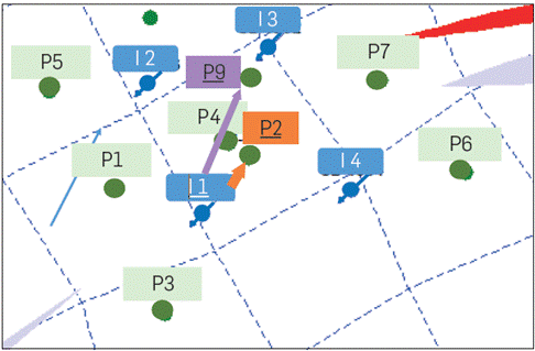 Figure 3b describes an injection pattern with a producer well confined by four injection wells. The WOR vs. Np plot suggests that increasing water production comes from injector wells I1 and I2 (symbolized by the red and yellow triangles). In this case, the analysis should combine the interpretation of the well to well injection-production history (e.g., I1 P5 and I2 - P5) and the information on well completion and injection profiles (orange and blue triangles represent the beginning of the injection in wells I3 and I4, respectively). Although the production of oil banks that appear as valleys in the WOR vs. Np plot is observed, these may be associated with injection into wells I3 and I4 or from secondary channels with lower flow capacity (Kh) from injectors I1 and I2.