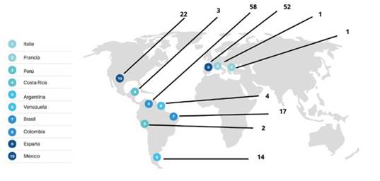 Una vez se completó el primer criterio de selección, fue necesario remitirse al lugar de la contribución académica, con el fin de establecer un mapeo de los discursos predominantes (figura 2) sobre la oralidad. Se seleccionaron aquellas investigaciones que marcaran geográficamente un mayor número de documentos sobre los estudios de la oralidad, dentro de los cuales sobresalen España, México, Brasil, Colombia y Argentina, y posibilitó delimitar un contexto iberoamericano.