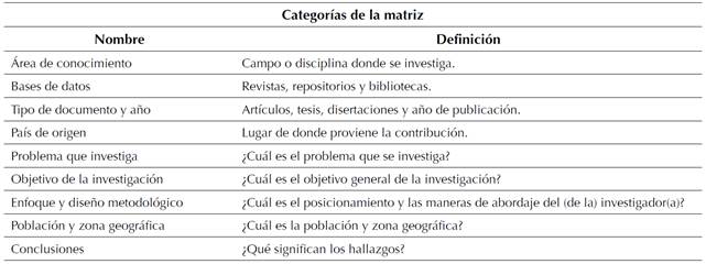 Una vez que se han seleccionado los textos, se continúa con la segunda etapa, “Diálogo entre autores”, en la que se determinan relaciones entre sus planteamientos y hallazgos, con el fin hacer visibles tendencias o perspectivas sobre el objeto de estudio y los ámbitos en los que impacta. En este sentido, las categorías de la matriz facilitaron patrones de cruzamientos que ayudan a encontrar ideas relevantes para la investigación (Eraso et al., 2012). Las constantes relaciones entre categorías y las sucesivas lecturas de la información desde una mirada vertical y horizontal en un plano bidimensional, a través de análisis comparativos, produce una saturación que da lugar a núcleos de información o correspondencias y establecen tendencias en un campo de conocimiento.