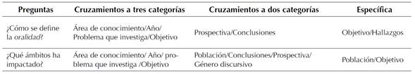 Nota: con el fin de resolver las preguntas planteadas se realizan cruces o relaciones de las categorías de la matriz para obtener patrones de información e identificar tendencias sobre las investigaciones de la oralidad en el periodo 2000-2021.