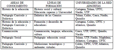 Como hemos indicado este doctorado de RUDECOLOMBIA se desarrolla en Ciencias de la Educación. Se inició con las áreas de formación en: Historia de la Educación Latinoamericana. Posteriormente, se organizaron las de Pedagogía Currículo y Didáctica, y Pensamiento Pedagógico y Comunicación. Actualmente, cuenta con seis líneas de formación61 que se trabajan desde los grupos de investigación. De todas maneras se debe tener presente que este doctorado surgió de una Red de Historiadores de la Educación Latinoamericana que en 1992 realizaron su primer Congreso en Santafé de Bogotá. Una de las conclusiones, de este evento, fue el de organizar un doctorado en esta área del conocimiento. Y, en este caso se demuestra la influencia internacional que el programa ha tenido desde los inicios al contar con el apoyo de la Sociedad de Historia de la Educación Latinoamericana. SHELA