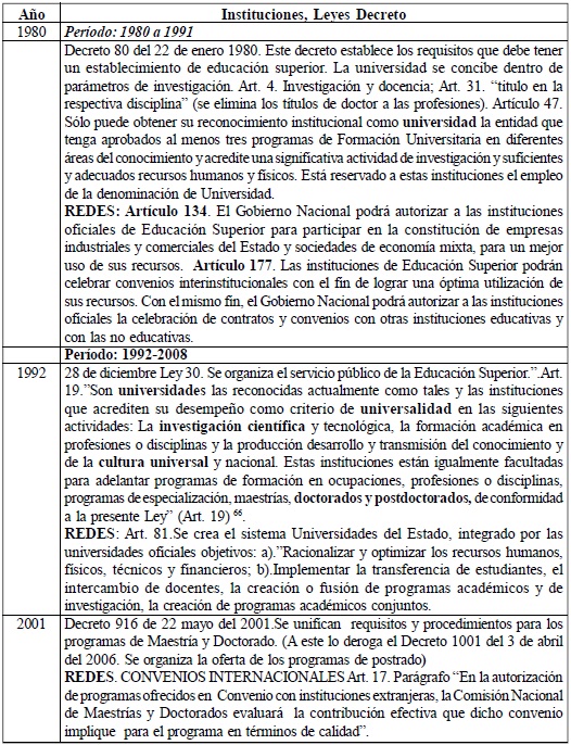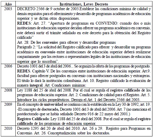 En el balance histórico legal se parte, de un primer período, cuando se establecen legalmente las redes universitarias en Colombia, dentro de la nueva concepción de universidad que se unía a la investigación, a partir del Decreto 080 de 1980 hasta la Constitución de 1991. El segundo período, a partir de la Ley 30 de 1992 con el impacto de la misma en la necesidad de presentar requisitos para la acreditación de programas de maestría y doctorado hecho que motivo la construcción de Redes académicas hasta el Decreto 1295 del 2010 que regula el Registro calificado y dentro de estos los programas en convenio.