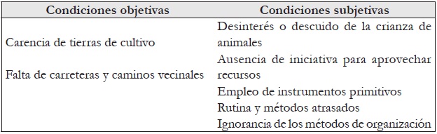 La pobreza de la gente puede dimanar de muchas circunstancias, como son: La carencia de tierras de cultivo, desinterés o descuido de la crianza de animales domésticos, empleo de instrumentos primitivos de labranza, rutina y métodos atrasados de trabajo, ausencia de iniciativa para aprovechar industrial o comercialmente los recursos naturales de la comarca, ignorancia de los métodos de organización para encontrar mercado de los productos rurales; falta de carreteras y caminos vecinales y de medios de transporte que faciliten la salida a los productos etc33.