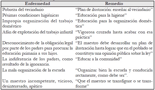 Para Ramírez la educación sería un bien mayor porque vencería muchos males sociales, uno de ellos el problema de la salud, a través de dispositivos como la higiene, el control de alimentos, la dieta, el manejo de técnicas para la producción de alimentos y cultivos en el campo, etc. También en esta posición se puede apreciar una nueva relación antitética entre el "saber de la comunidad" y el "saber de la escuela". La escuela es la institución que deberá arremeter contra el saber experiencial, propio de la ignorancia, el fanatismo, la superstición, situaciones que dañan a las comunidades hundiéndolas en su propio atraso. La educación combatirá estos males; esta noción de combate, propia de la cruzada espiritual guerra contra el fanatismo, acentúa la figura del apóstol, figura necesaria en la consolidación de un imaginario docente que guía sus acciones hacia una ruta: la misión de transformar las comunidades en escenarios de progreso, como se muestra en el cuadro 3.