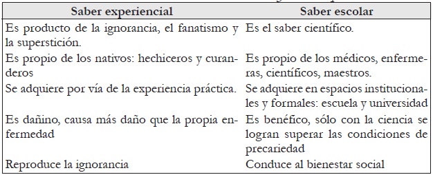 En este cuadro se puede ver la relación, nuevamente antitética o maniquea, que expresa la distancia entre el conocimiento de la comunidad y que la escuela en su misión tendría que derribar para imponer su ciencia a través del saber adquirido, sí y sólo sí, en su institucionalidad.