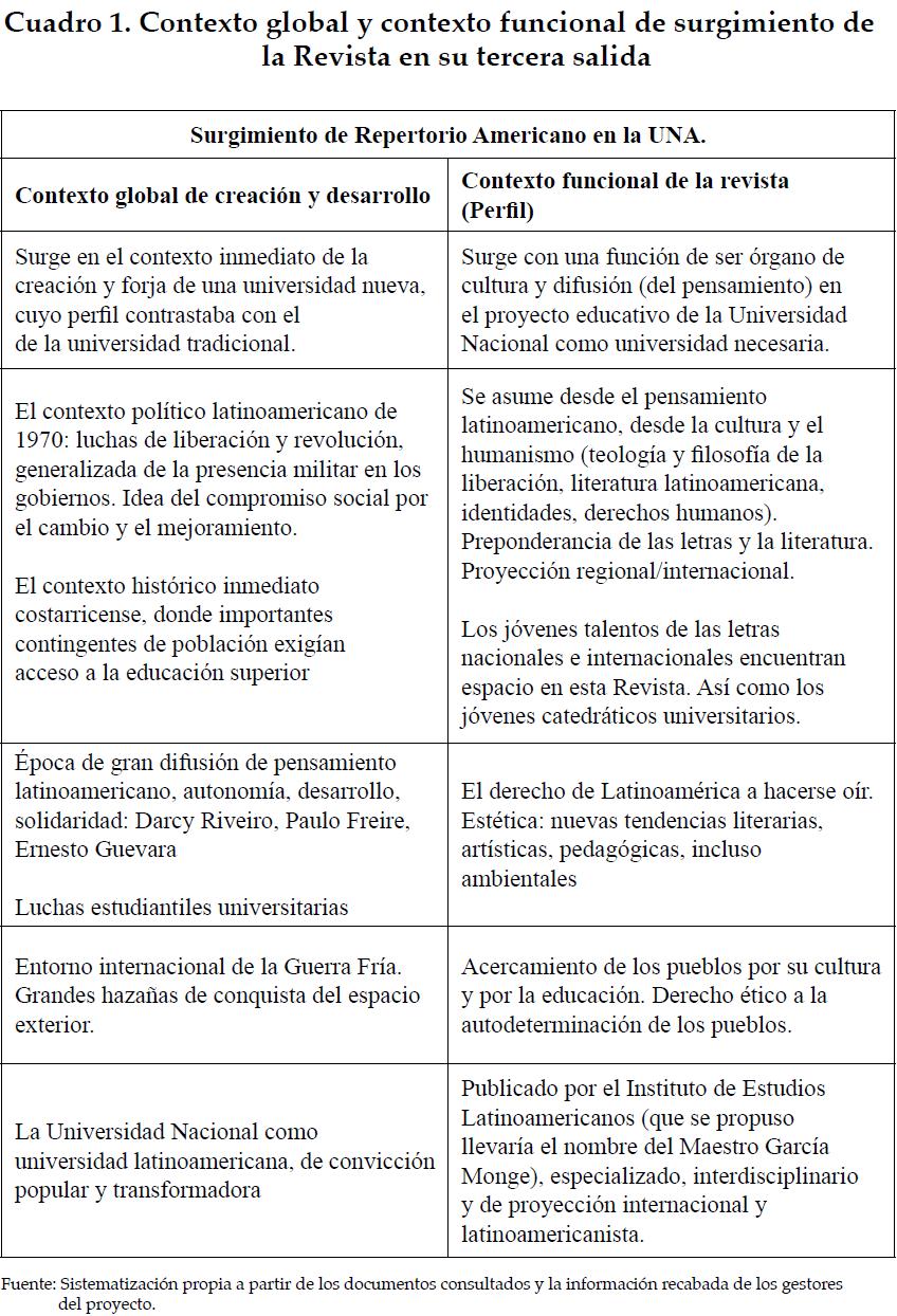Repertorio Americano se desarrolla en un contexto donde las relaciones sociales que animaron su edición eran fundamentalmente académicas, instituidas por el proyecto pedagógico, político y cultural universitario. Esto es claro en la información que se ofrece desde en el primer ejemplar en 1974 sobre la Revista, al considerarse que su edición solo sería posible en un instituto interdisciplinario y especializado en América Latina, con lo cual se delimitaba también el campo de penetración de la Revista: