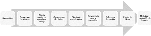 A partir de los talleres programados, el Bicinet se desplazada pedaleando por un equipo de tres personas a cada comunidad llegando con música y dinamismo para atraer la atención de los transeúntes y población a participar, luego instalándose en un parque, calle o acera segura para los participantes. Para un total de catorce (14) talleres de tres (3) horas y un taller adicional con las mamás de los asistentes de la Fundación Semillas.