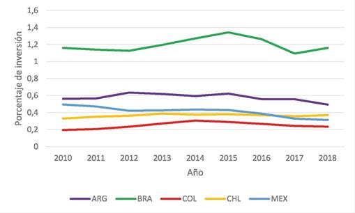 En el gráfico 5 se presenta el comportamiento de I+D según el PIB de algunos países de Sur y Centroamérica: Brasil, Argentina, Colombia, Chile y México. Se observa que Colombia tiene menor inversión porcentual, con un promedio, en los últimos años, de 0,25 %.
