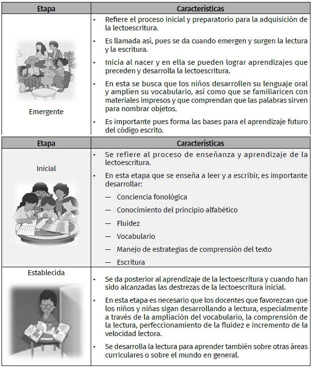 Considerando la importancia de la lectura y la escritura, es necesario profundizar en las etapas que el ser humano debe ir desarrollando para alcanzar la competencia de la lectoescritura. En tal sentido, esta se desarrolla a través de tres etapas específicas, las que, de acuerdo a Camargo, Geraldina, Raquel Montenegro, Sophia Maldonado y Justo Magzul (2016) son: 1) emergente; 2) inicial; y 3) establecida. Estas están directamente relacionadas con las fases del desarrollo humano y que no son exclusivas de la escuela como tal; pues esta inicia a través de la etapa emergente que sobre todo se estimula desde el nacimiento en el hogar y se convierte en preparatoria para la etapa inicial. Los padres desde la casa y dentro del marco de la primera fase de la primera infancia, son los encargados de desarrollarla.