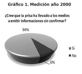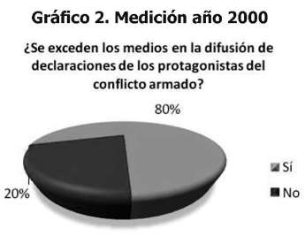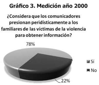 Allí se confirmaron los excesos en los cuales habían incurrido los medios de comunicación en los casos aquí señalados, propiciados por la moda de la información en directo introducida por los programas informativos de los nacientes canales de televisión privada. Los periodistas entrevistados en la investigación publicada el 9 de febrero de 2000 reconocían que el síndrome de la chiva estaba vivo (94%) (gráfico 1); además, calificaron de excesiva la difusión de declaraciones de los protagonistas del conflicto armado (gráfico 2) y se mantenía —pese a los mea culpa— la presión periodística a las víctimas de la violencia y a sus familiares (gráfico 3).