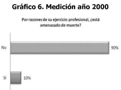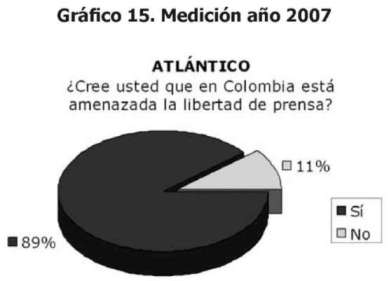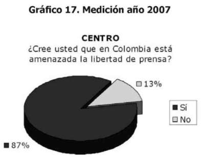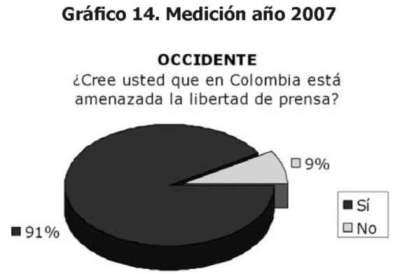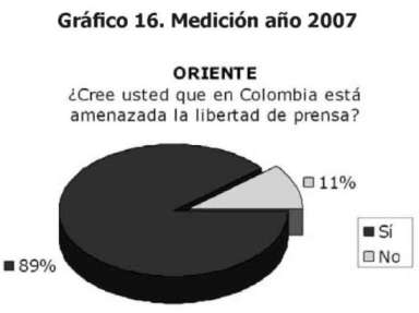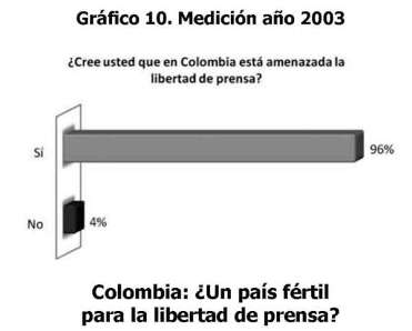 La medición al estado de la libertad de prensa realizada en 2003 incluyó una variable que no había sido investigada, pero que en adelante evidenciaría la realidad del fenómeno en Colombia: ¨Cree usted que en Colombia está amenazada la libertad de prensa? Los resultados fueron contundentes: el 96% de los periodistas respondió positivamente (gráfico 10). Esta fue la voz de alarma (la de los afectados) para que el 3 de mayo de 2003 "el Comité para la Protección de Periodistas (CPJ, siglas en inglés) incluyera por primera vez a Colombia en la lista de los 10 peores lugares del mundo para ejercer el periodismo, al lado de Irak, Cuba, Afganistán, Vietnam, Chechenia, Gaza, Cisjordania, Eritrea y Togo. Obsérvese que entre los países citados, el único que se rige bajo un sistema de democracia liberal del tipo occidental, es el nuestro" (Velasquez, 2003).