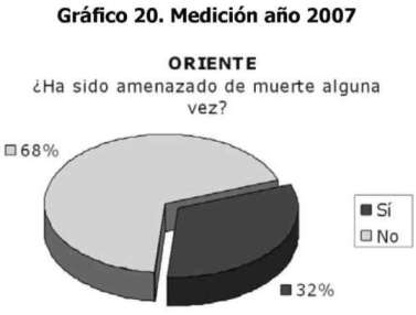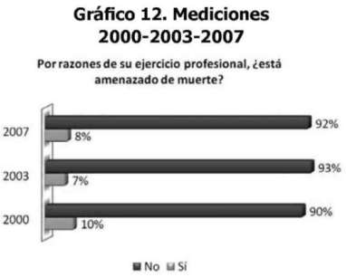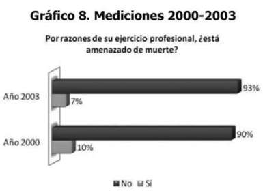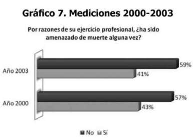 Dadas las circunstancias, y los pocos cambios evidenciados en los dos años siguientes, el Observatorio de Medios de la Universidad de La Sabana hizo una segunda medición del fenómeno en 2003. Para entonces, el porcentaje de periodistas amenazados se redujo con relación a la medición del año 2000 del 10 al 7% (gráfico 7 y 8), disminución que resultó poco significativa si se tiene en cuenta que el 3% diferencial podría estar representado por los periodistas asesinados durante el periodo8; según la Sociedad Interamericana de Prensa, entre enero de 2000 y diciembre de 2003 fueron asesinados 32 periodistas (SIP, 2008).