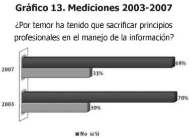 La multitud de presiones que tienen que enfrentar a diario los periodistas los lleva a asumir la denominada "Ley del silencio" como mecanismo de protección, fenómeno que reconoce sin tapujos el 31% de los comunicadores entrevistados, según se registra en el gráfico 13. De acuerdo con el Informe Anual de la Relatoría Especial para la Libertad de Expresión de la Organización de los Estados Americanos: "[...] cuando los Estados no garantizan el derecho a la vida, los periodistas tienen que elegir entre continuar poniendo en riesgo sus vidas y muchas veces las de sus familiares, o bien abandonar sus investigaciones y dejar de informar sobre determinados temas" (CIDH, 2006).