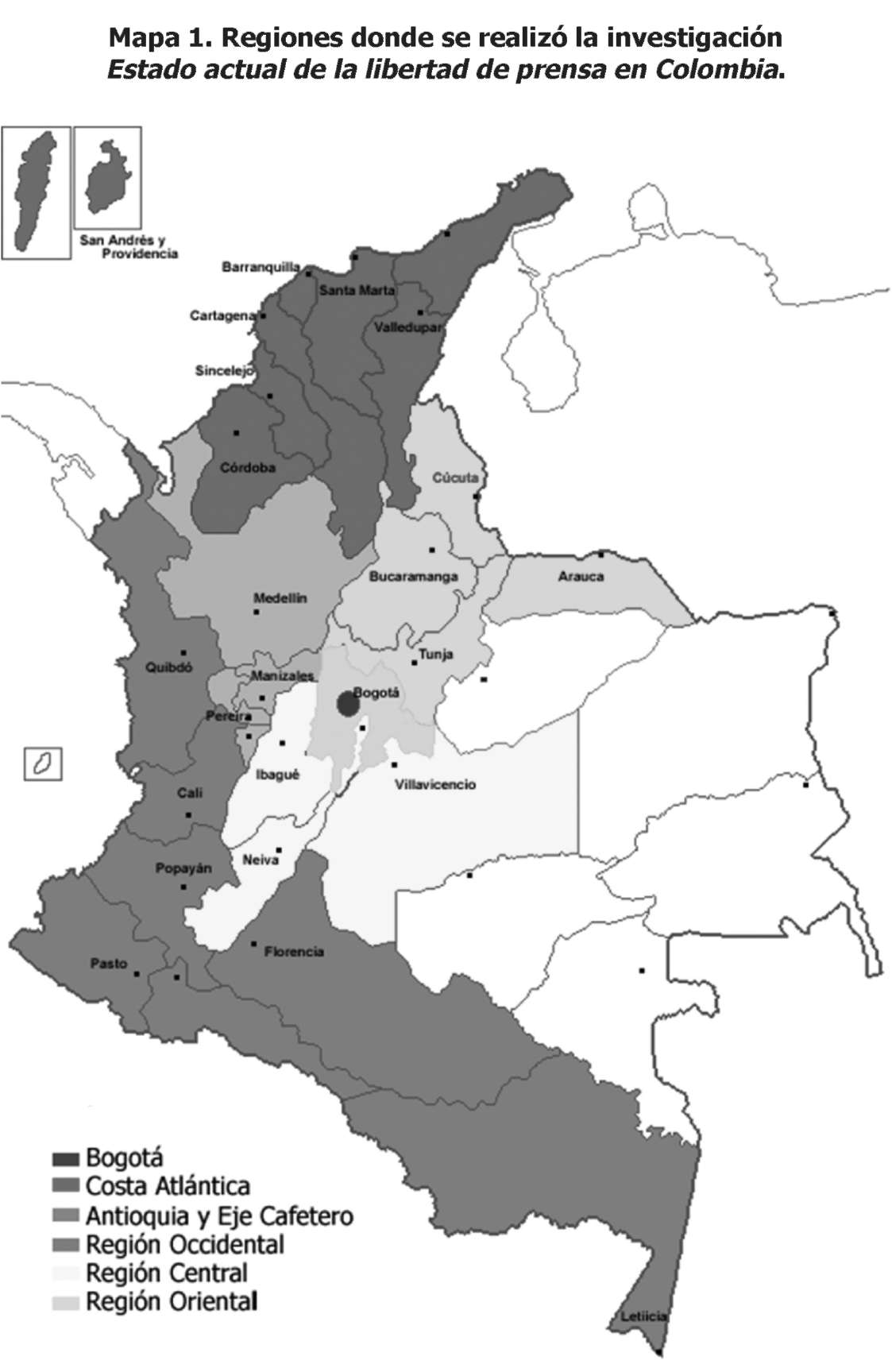 Como se advirtió, las regiones Atlántica (conformada por los departamentos de Atlántico, Magdalena, Córdoba, Sucre, Bolívar, Cesar y La Guajira), Oriental (Boyacá, Santander, Norte de Santander y Arauca) y Central (Cundinamarca, Meta, Tolima y Huila) presentan altas tasas de vulnerabilidad según las mediciones del Observatorio de Medios en 2003 y 2007.