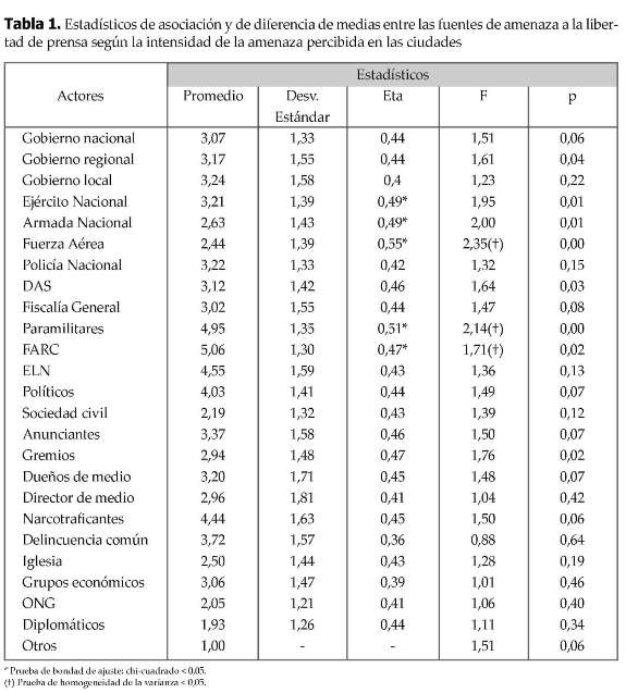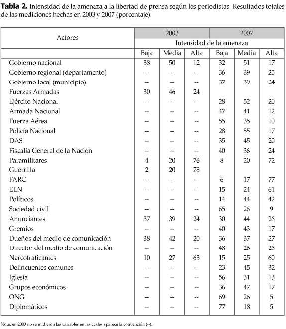 Mientras que el mandatario, apoyado en la sensible disminución del número de periodistas asesinados —nueve entre enero de 2004 y diciembre de 2006—, afirmaba en Cartagena ante la Asamblea de la Sociedad Interamericana de Prensa que Colombia "(...) es un suelo fértil para la libertad de prensa (...)" (Uribe, 2007, p. 24) el riesgo se transformó y adoptó sutiles formas de presión —no menos peligrosas—, y emergieron muchos más actores de amenaza como se evidencia en la tabla 1, en la que se registran al menos 24 de estos grupos, y donde se destaca la acción intimidatoria a la libertad de prensa por parte de organizaciones al margen de la ley (FARC 5,06%, ELN 4,55%, paramilitarismo 4,95%, narcotraficantes 4,44%) y políticos 4,03%11.