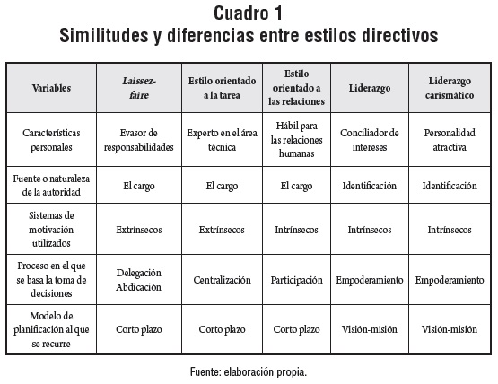 Al agrupar las dimensiones por similitudes y diferencias se obtienen cinco estilos esenciales o prototípicos: 1) estilo laissez-faire, 2) estilo orientado a la tarea, 3) estilo orientado a las relaciones, 4) liderazgo y 5) liderazgo carismático. Los estilos resultantes se presentan en el cuadro 1.
