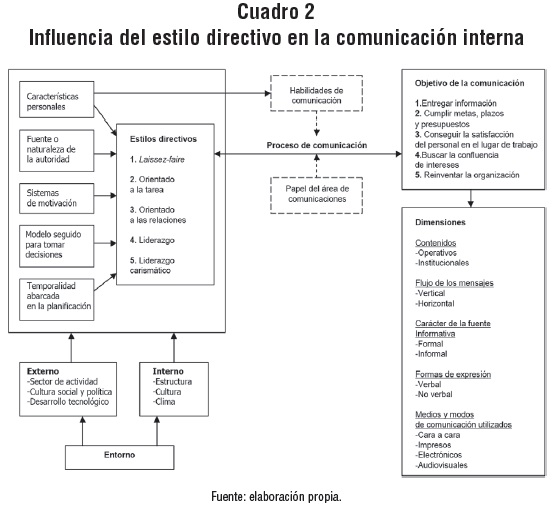 En el cuadro 2, "Influencia del estilo directivo en la comunicación interna", se establecen relaciones entre la manera como se conduce una organización y los modos de comunicación esperados para cada estilo directivo.