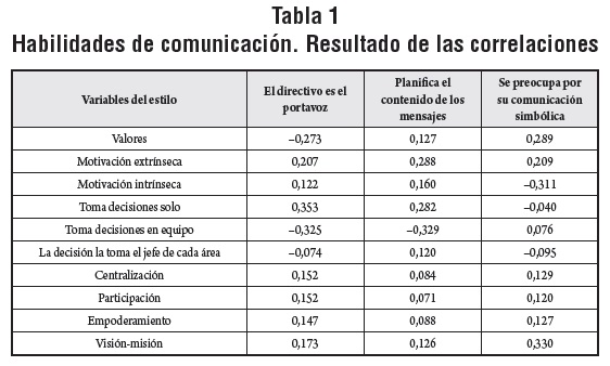 Los resultados de las correlaciones sobre habilidades de comunicación se presentan en la tabla 1. Los datos obtenidos no muestran relaciones significativas entre la función del directivo como portavoz, que es la medida que se ha tomado como referente de coordinación de la comunicación, y las variables del estilo. Tampoco se observa que la planificación de los mensajes que el directivo emite en reuniones y plenarias esté relacionada con el liderazgo. Tampoco se han dado relaciones significativas entre el control de la comunicación simbólica y las variables del estilo. El valor más alto que arrojan las mediciones se presenta en la relación que resulta con la visión y misión, modelos de planificación propios del liderazgo (0,330).
