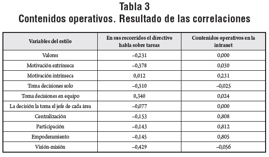 En relación con los contenidos se ha encontrado que el nivel en que los entrevistados intercambian información relativa a tareas durante sus recorridos tiene una relación negativa con la existencia de la misión y la visión. El valor de la correlación (-0,429) muestra indicios de relación negativa entre contenidos operativos y liderazgo, lo que aportaría sustento a las proposiciones planteadas en el modelo de relaciones entre estilo y comunicación interna.